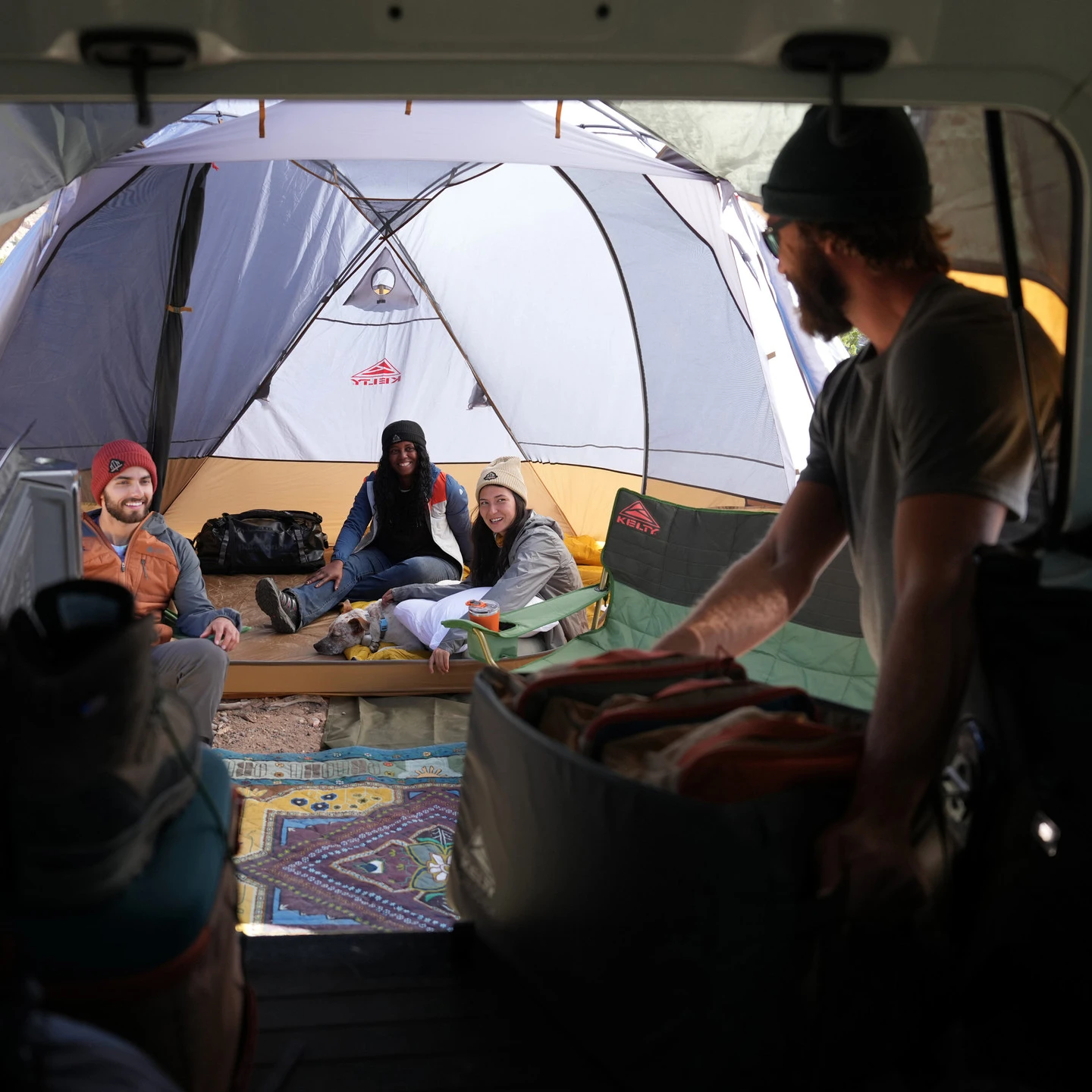 We’ve all been there: it’s 28 degrees at 3:15 a.m. Your boots are by the fire pit…your pants are…somewhere…and your toastiest extra layer is in the car. That’s exactly why we cooked-up the Caboose: the brilliant hybrid shelter that invites your vehicle (and all of its tempting contents) to the party. Just attach the extended awning to your open hatch, and you’ve got a free-standing tent with an extra rumpus room on wheels! Kelty Quick-Corners make setup a breeze, and a Shark-Mouth duffle lets you hit the road in record time. And did we mention, the extended awning turns into a massive vestibule when not connected to your car. Not too shabby.